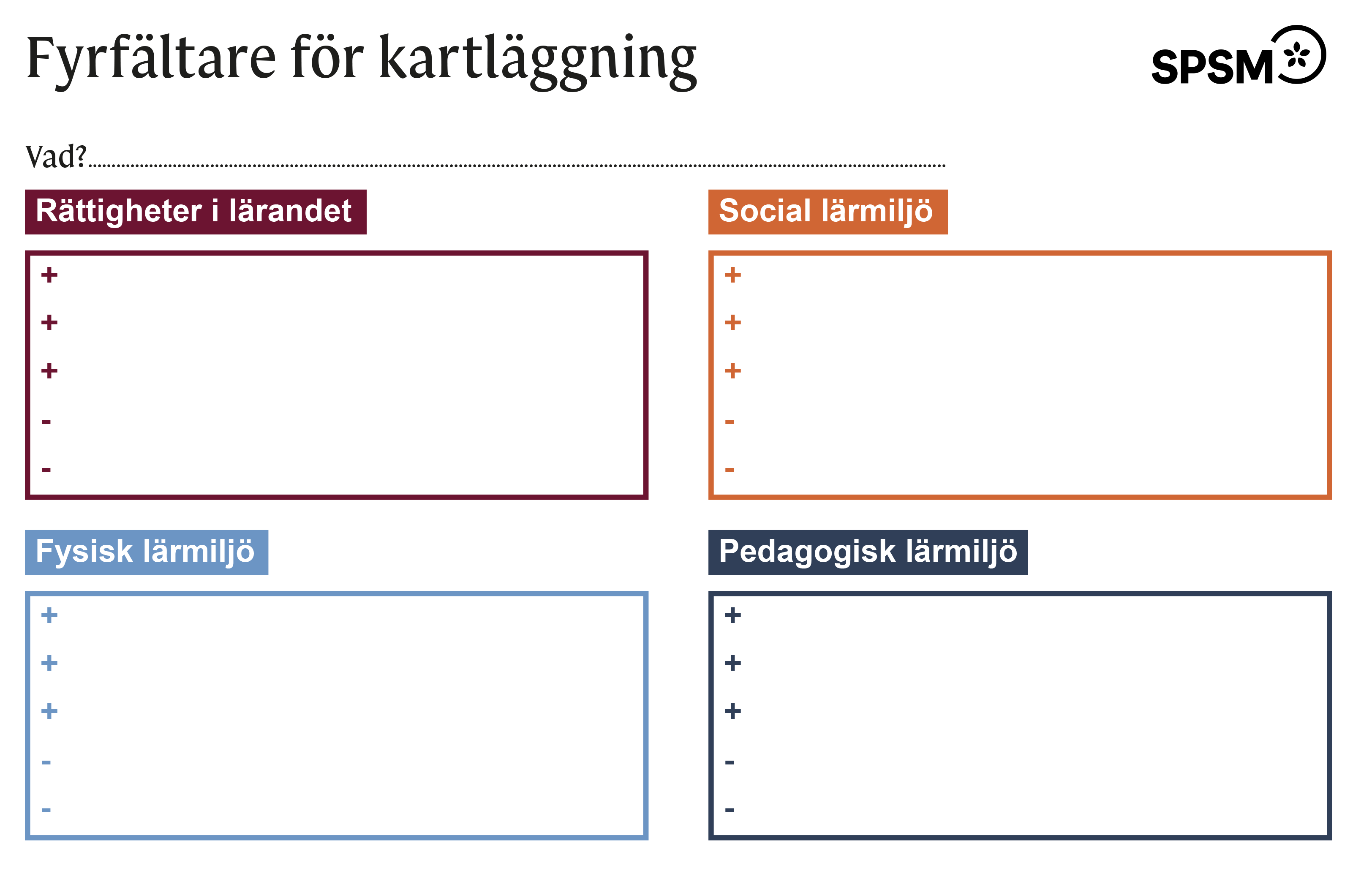 - Fyrfältaren finns att också att ladda ner som en digitalt ifyllbar pdf. I den går det att skriva in kortare texter. När ni har behov av att skriva mer text än så rekommenderar vi er att använda ert eget system för dokumentation.
