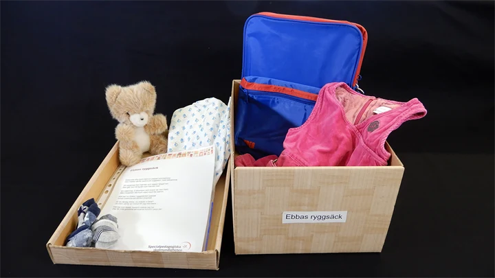 Lägg föremål som är kopplade till en viss berättelse i en låda. Det kan till exempel vara saker som är kopplade till en saga eller till en berättelse som handlar om när barnet reser till mormor och morfar för att sova över.
