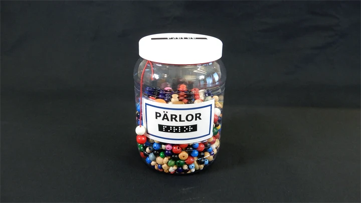 Bilden visar en burk med pärlor som är uppmärkt med svartskrift, punktskrift och pärlor på en tråd.