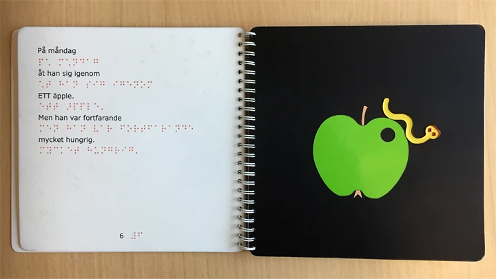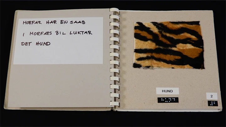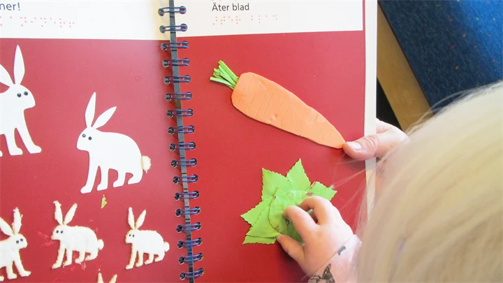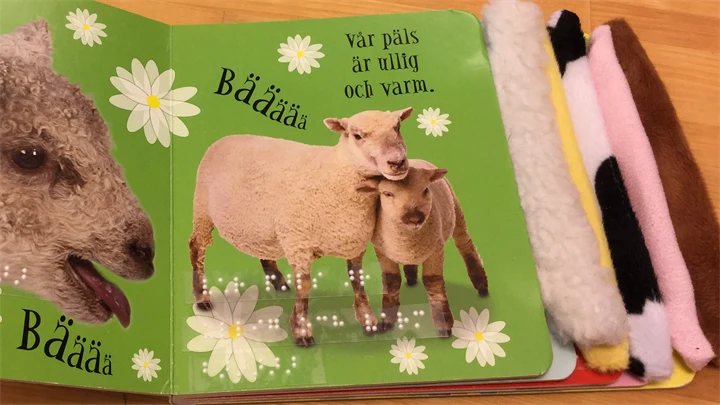 Bilden visar en bilderbok som är anpassad med punktskrift och taktila material.