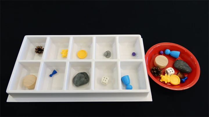 - Fortsätt med strukturerade övningar och lekar där barnet ska sortera och para ihop föremål som är tydligt lika eller olika, till exempel genom att placera dem i olika fack, se bild. Samtala om vad som gör att föremålen känns lika och olika.