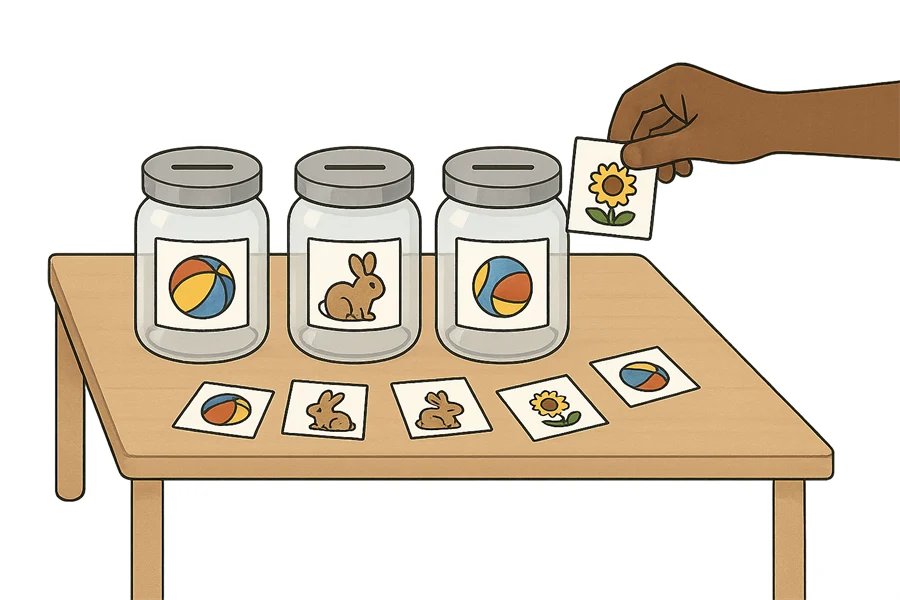 - Markera varje burk med någon av de bilder som ska sorters.